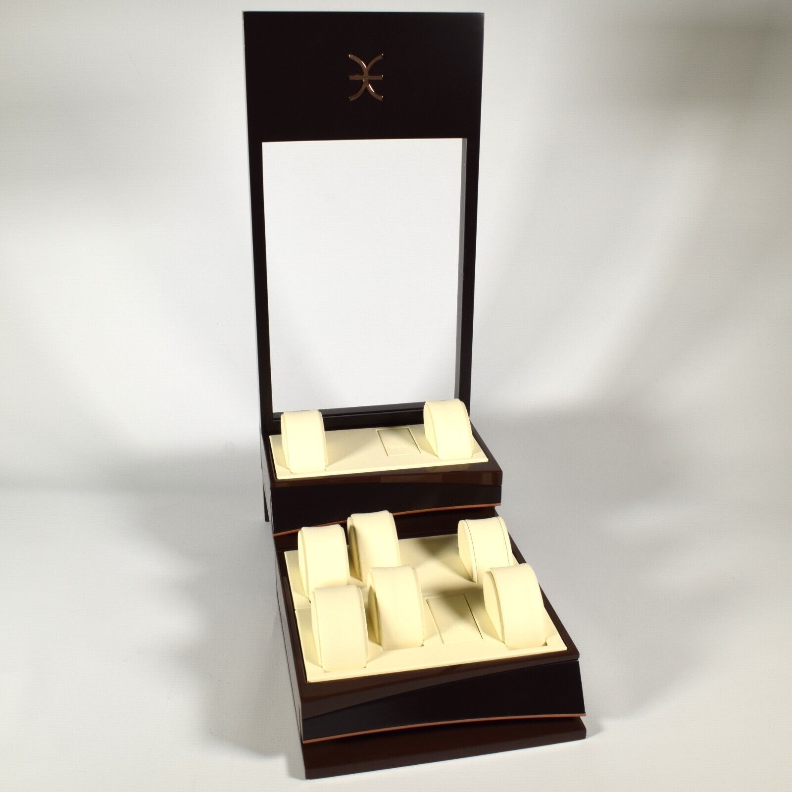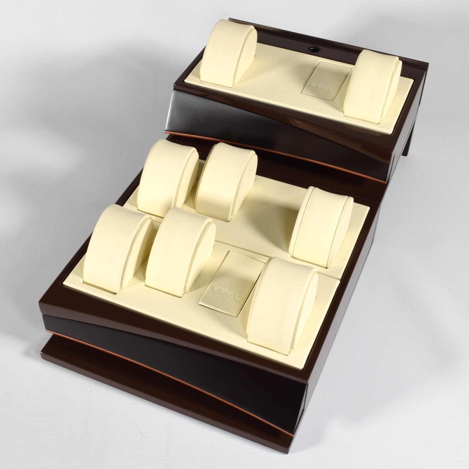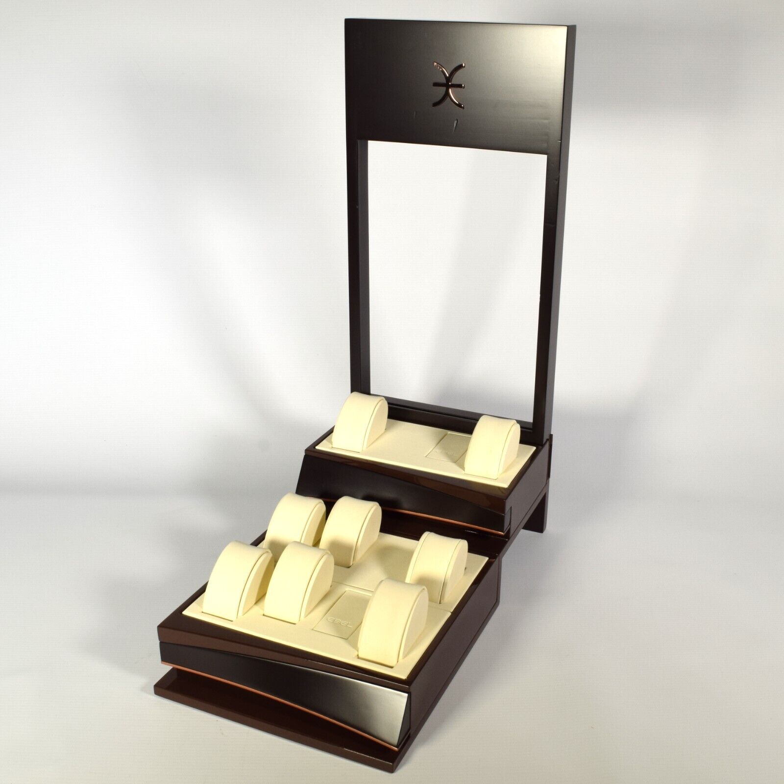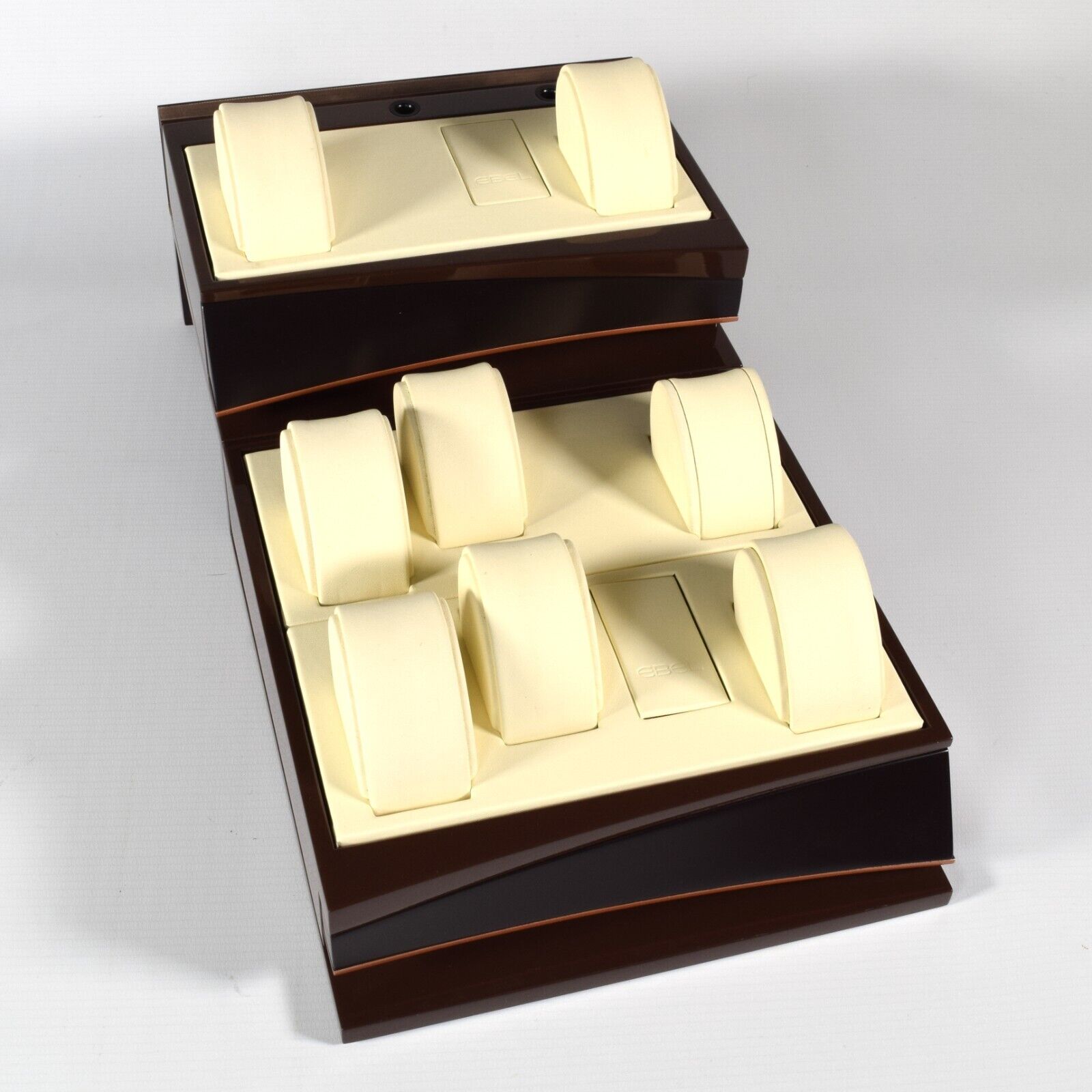 This is a genuine EBEL watch display stand originally used in an authorised EBEL retailer’s window display. The stand is finished in a high-gloss brown with a cream leather interior and features a two-level layout designed to hold multiple watches securely and attractively.