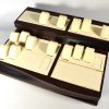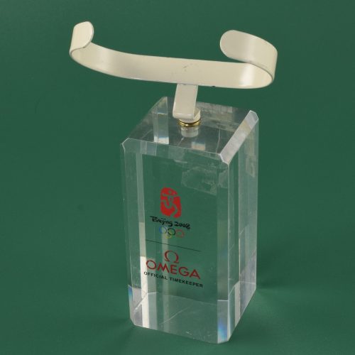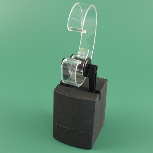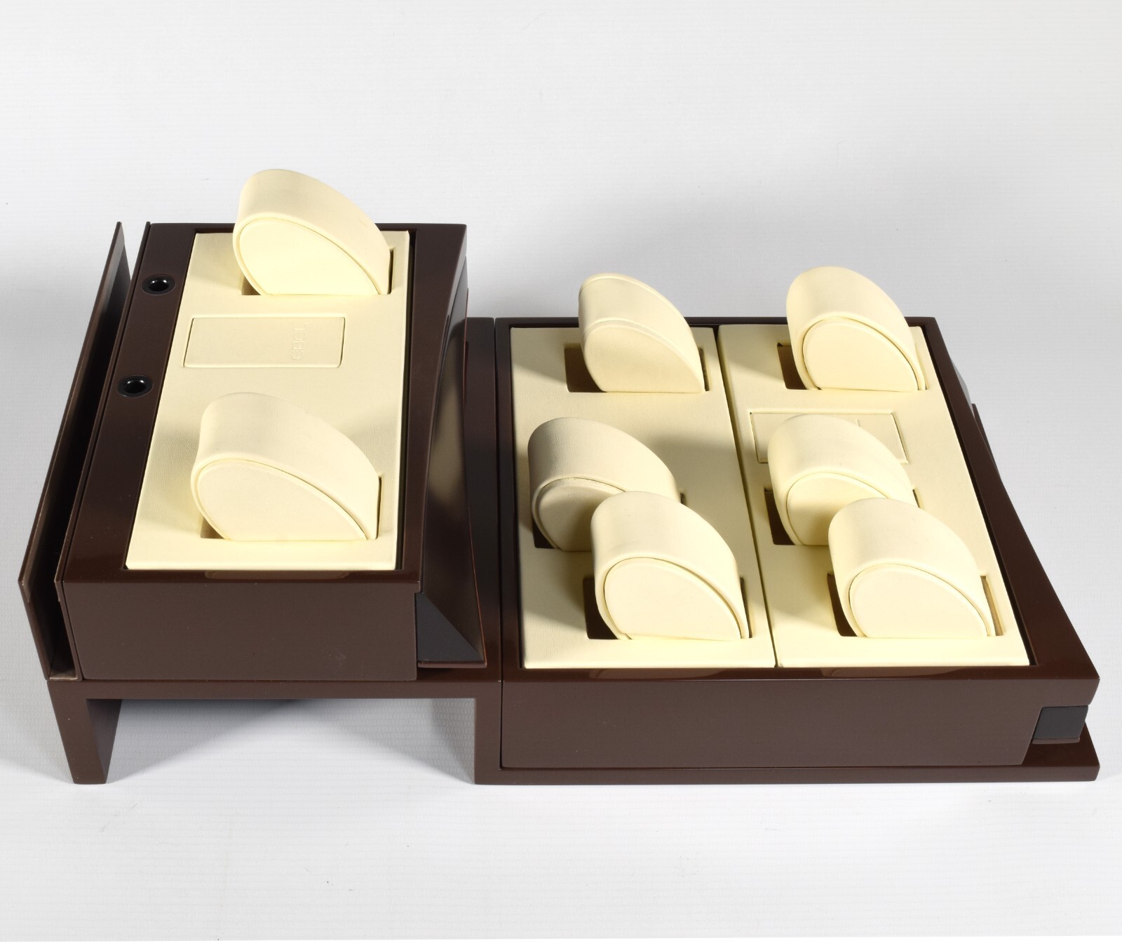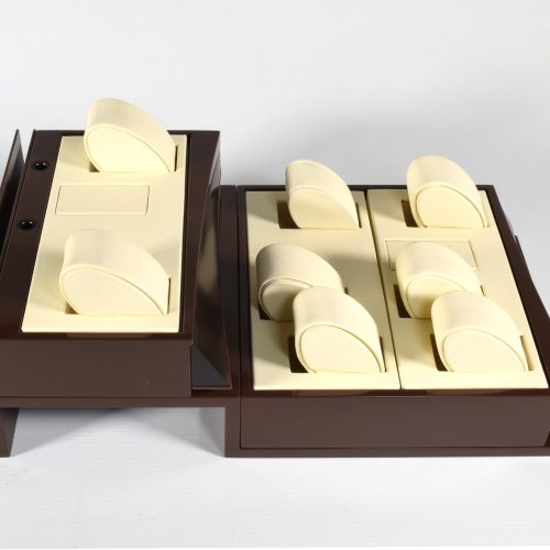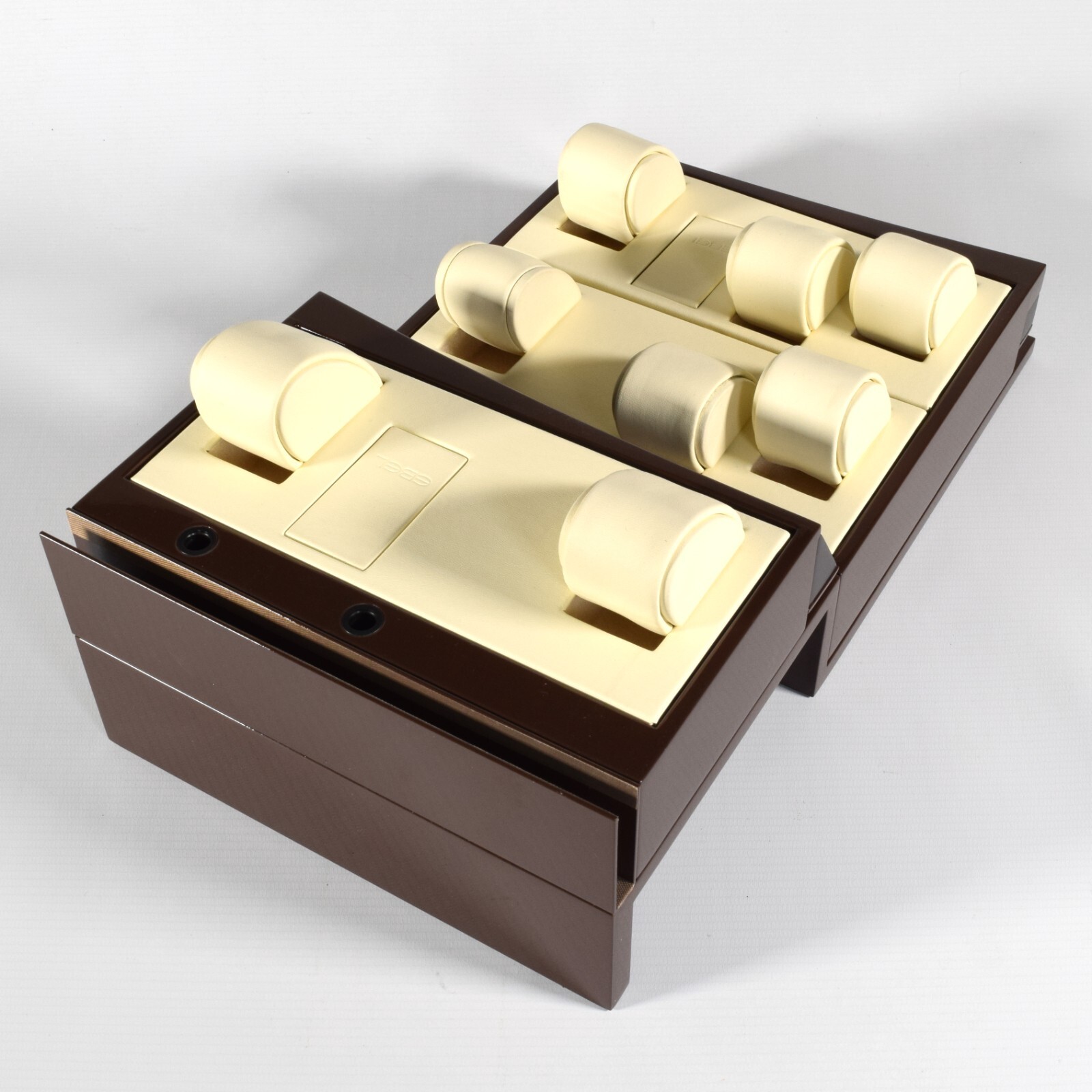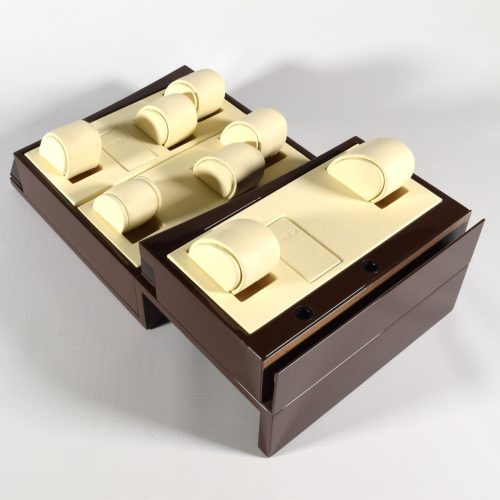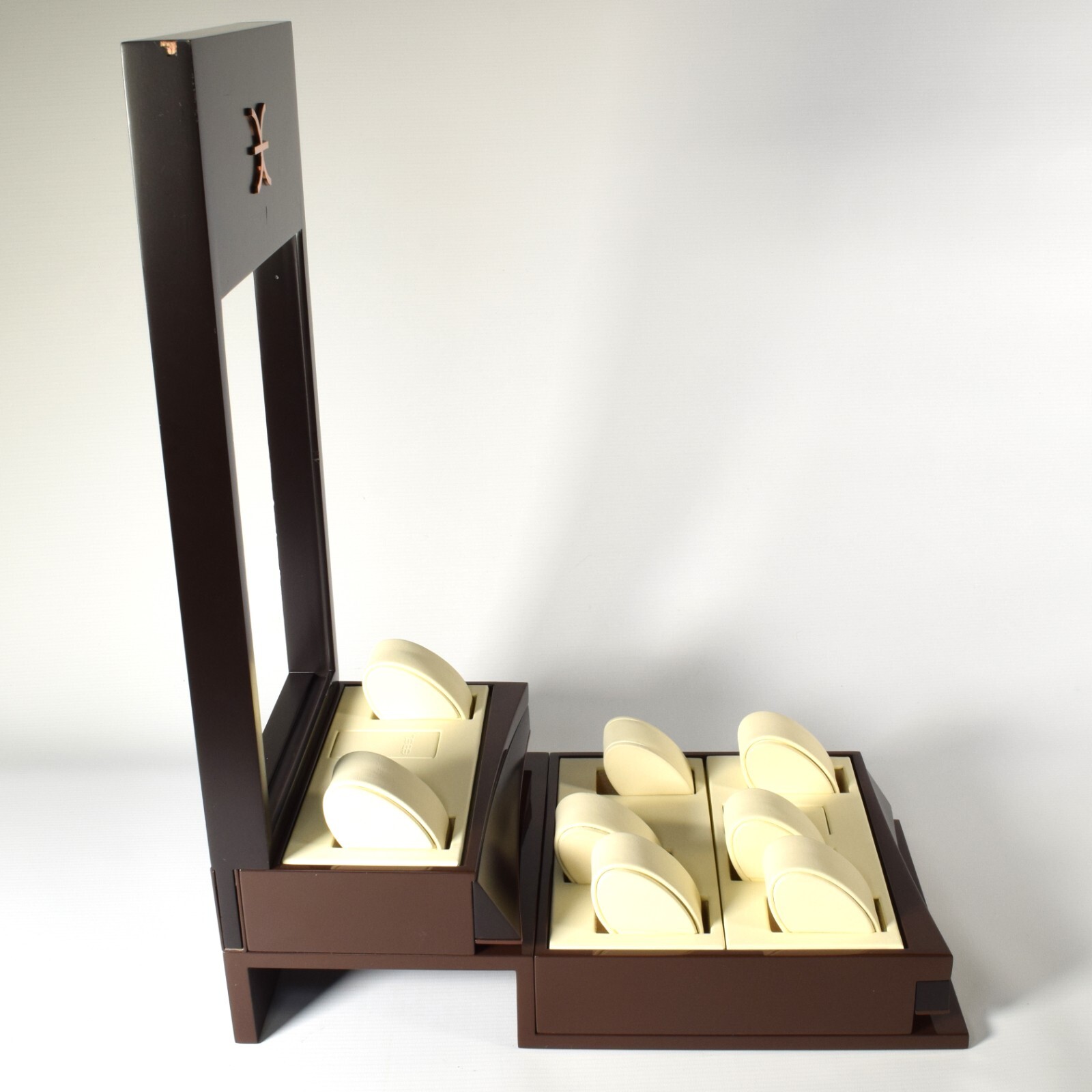 This is a genuine EBEL watch display stand originally used in an authorised EBEL retailer’s window display. The stand is finished in a high-gloss brown with a cream leather interior and features a two-level layout designed to hold multiple watches securely and attractively.