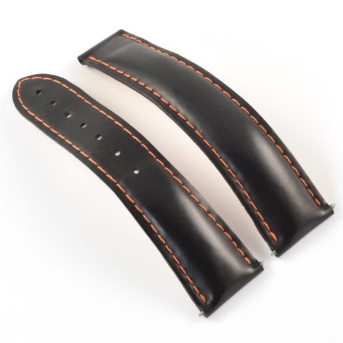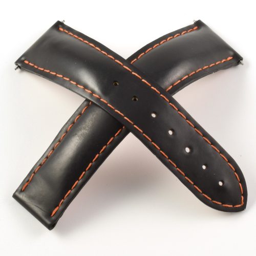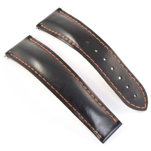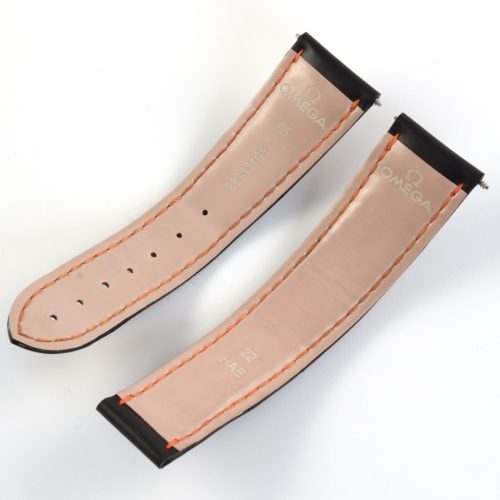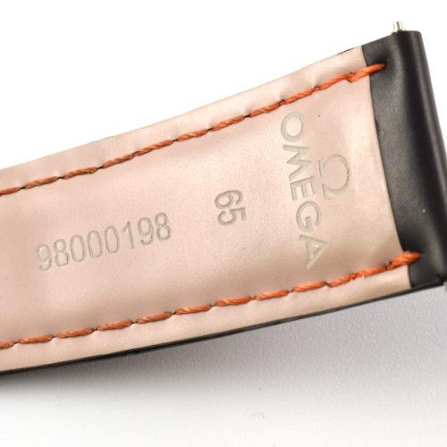 This is an authentic Omega black rubber watch strap with orange stitching, model number 98000198. It is designed to fit Omega Planet Ocean 600M 45.5mm models and has the model number clearly stamped on the underside.