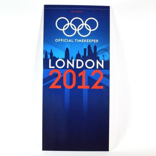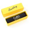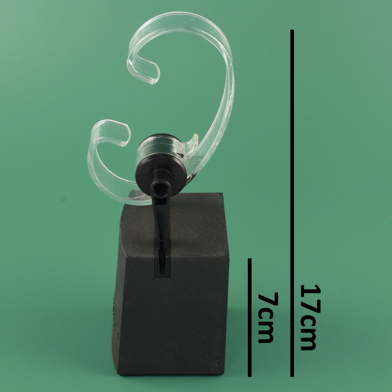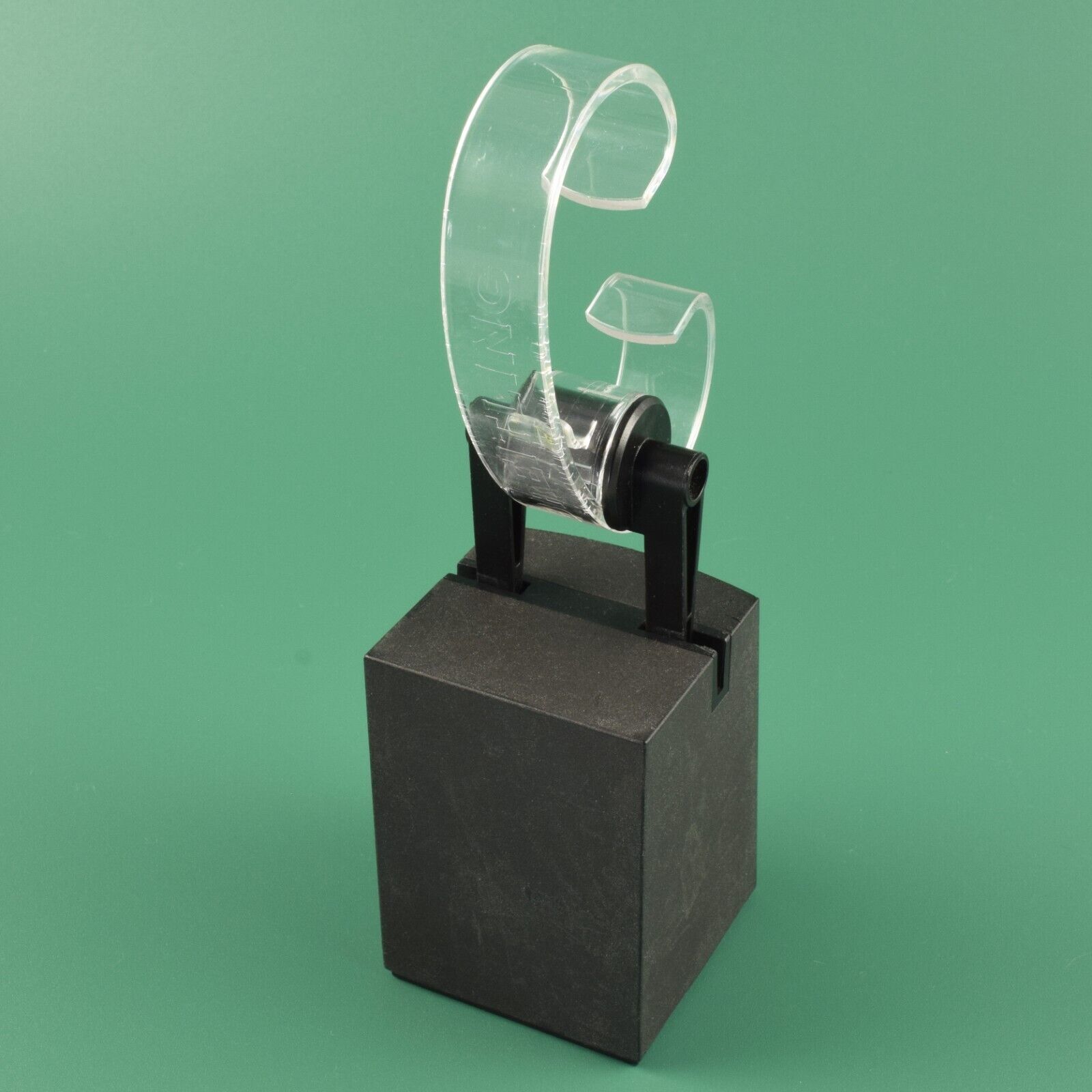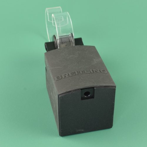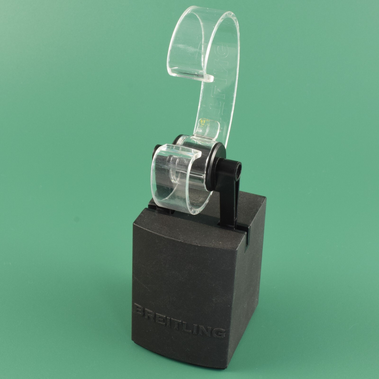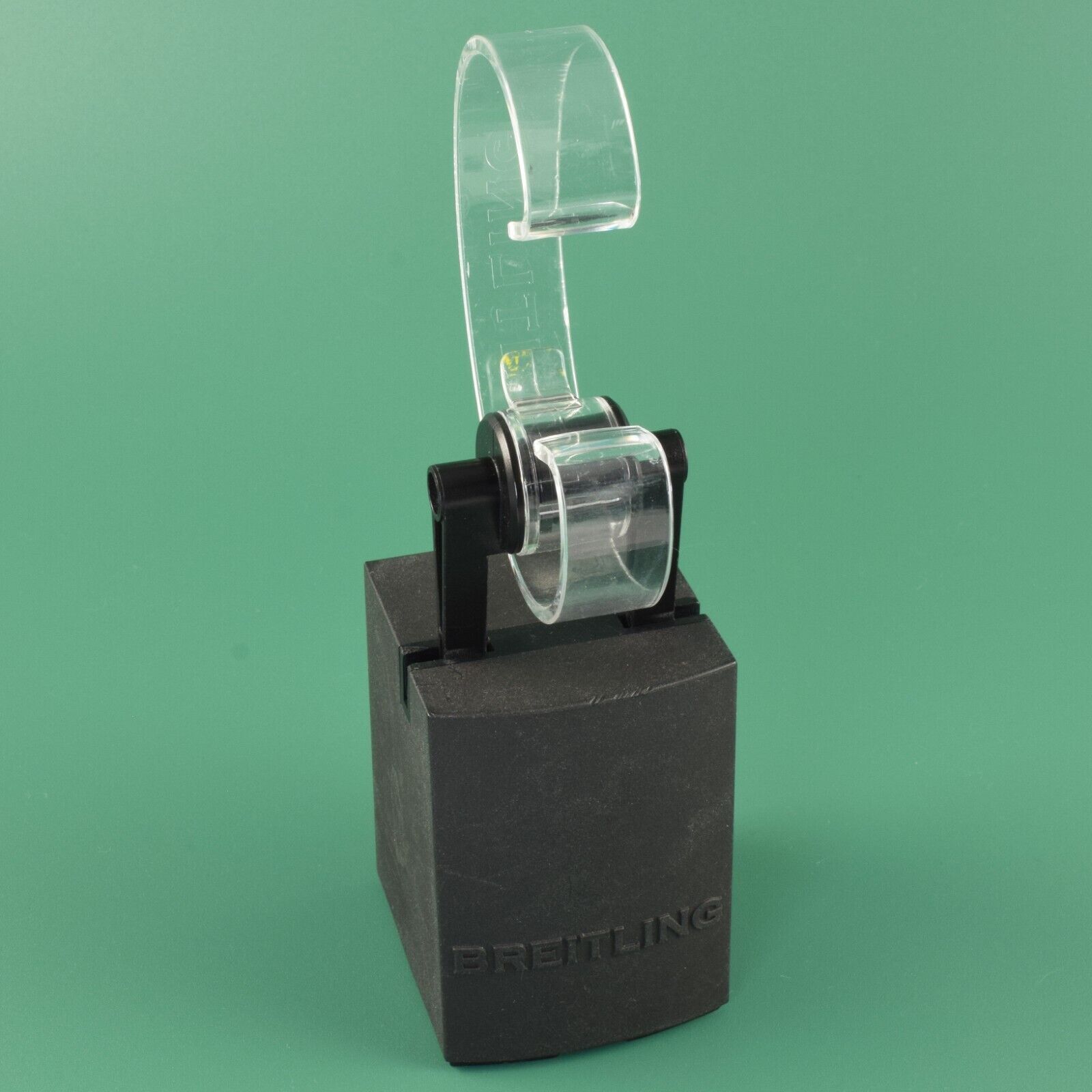This is an authentic Breitling watch display stand, originally used in a Breitling retailer’s shop window. It features a clear plastic holder mounted on a tall black base with the Breitling name embossed on the front.