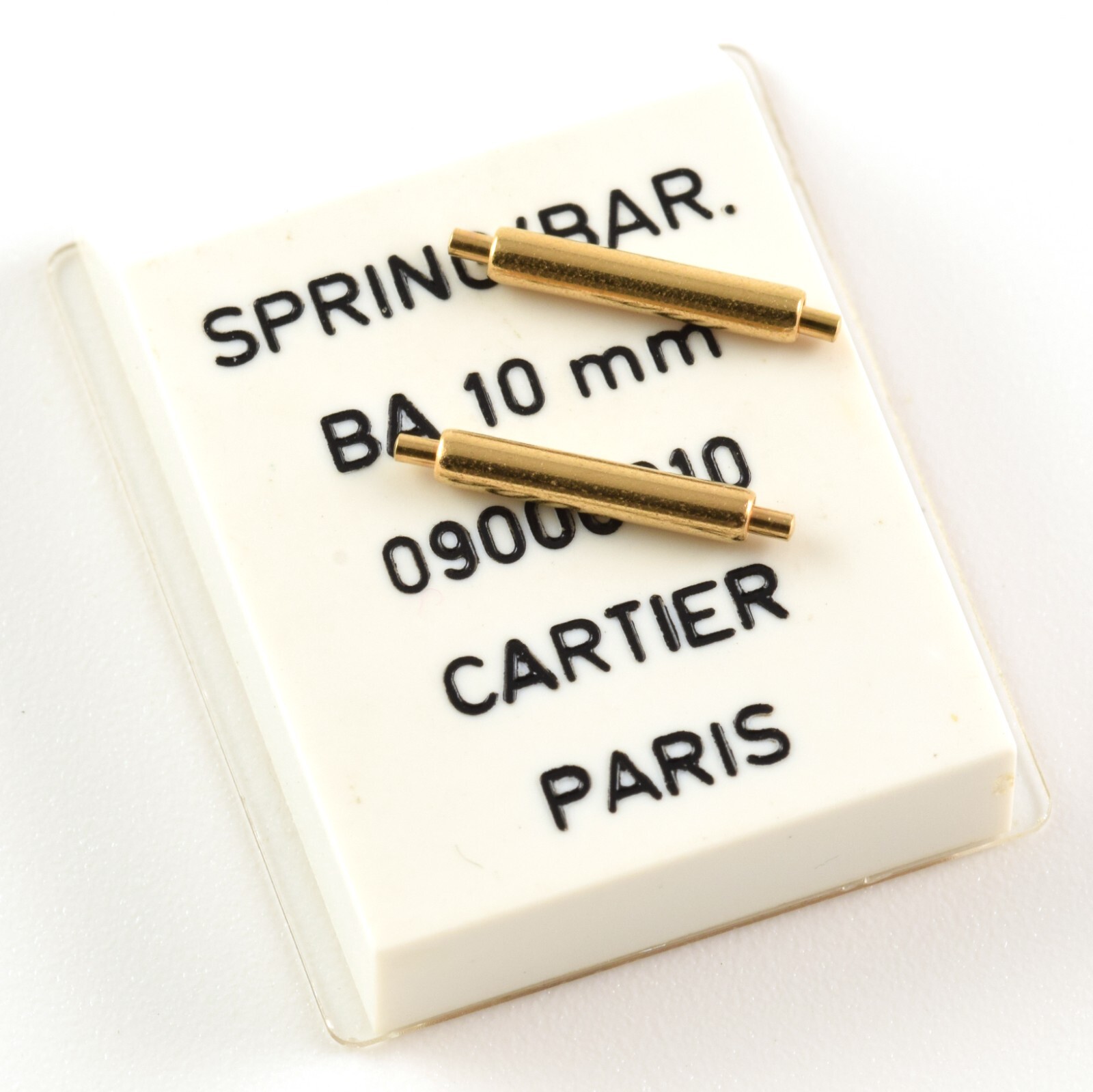This is a set of 20 authentic gold plated Cartier spring bars with a single shoulder design. These spring bars measure 1.8mm in diameter and are made to fit Cartier watches with 10mm lug widths, commonly found in vintage Cartier models such as the Tank Francaise.