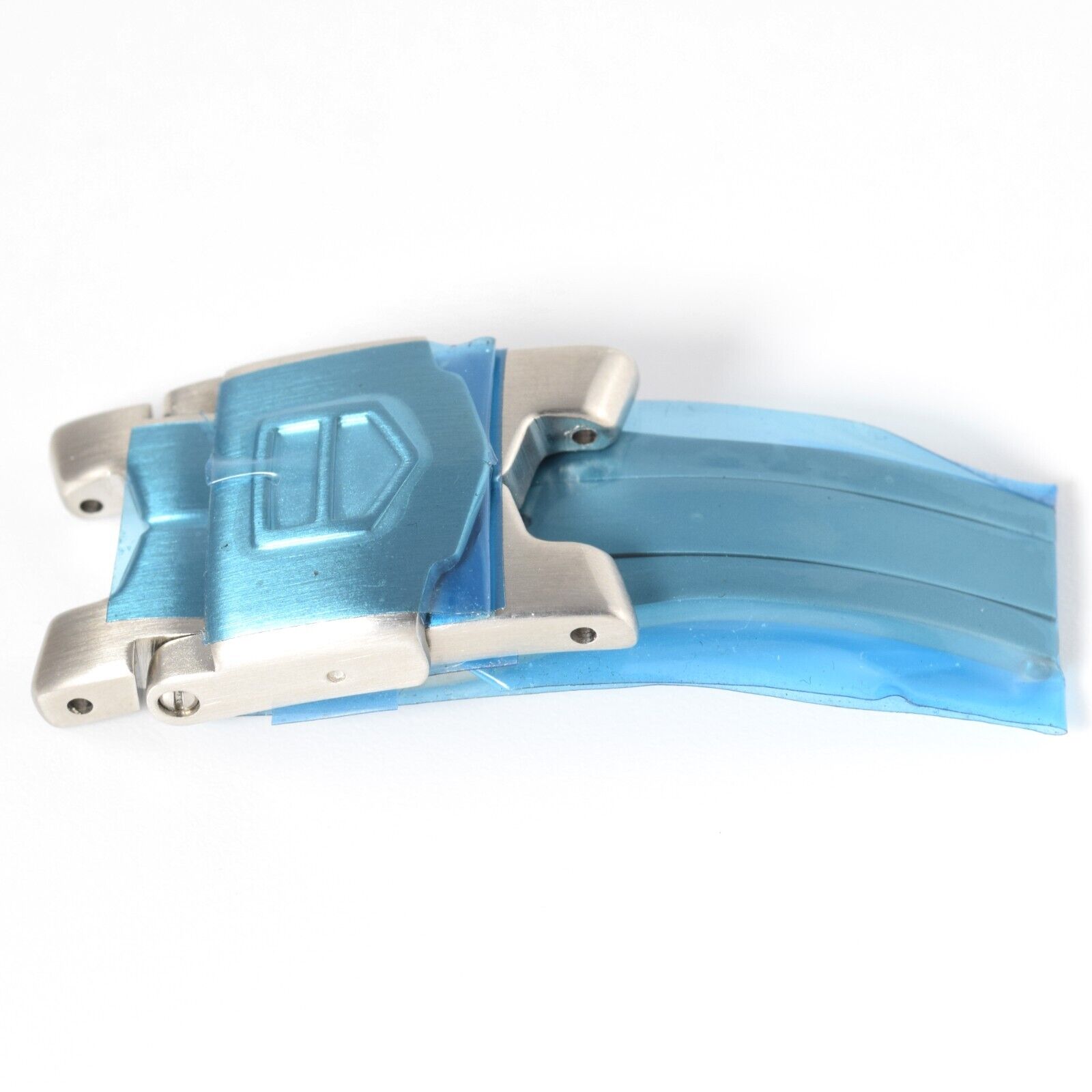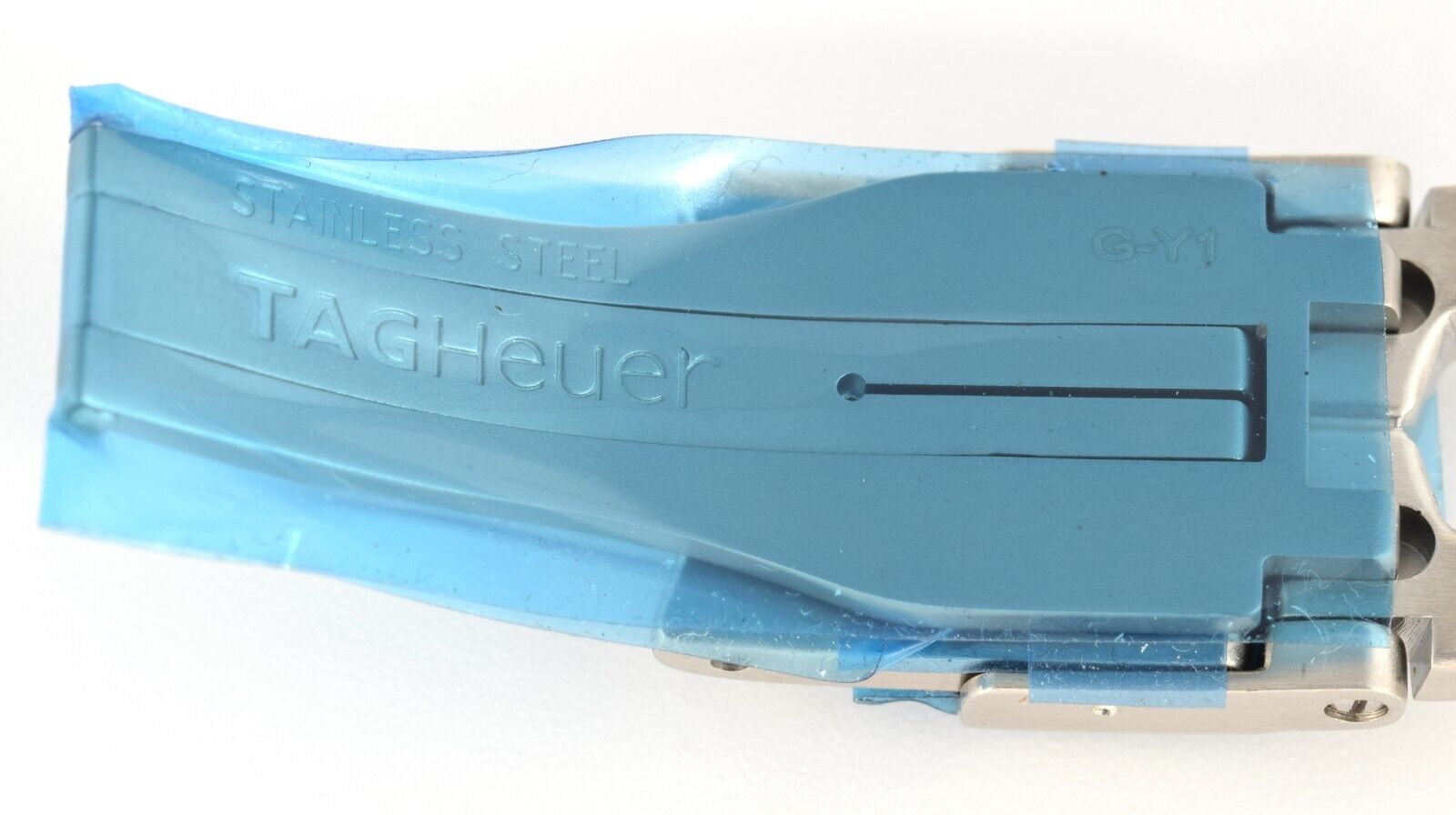 This is a new and authentic TAG Heuer 16mm steel clasp buckle made to fit TAG Heuer Link Series watches. It is made from high-quality stainless steel and comes with protective blue film intact, ensuring the clasp is in unused condition.
