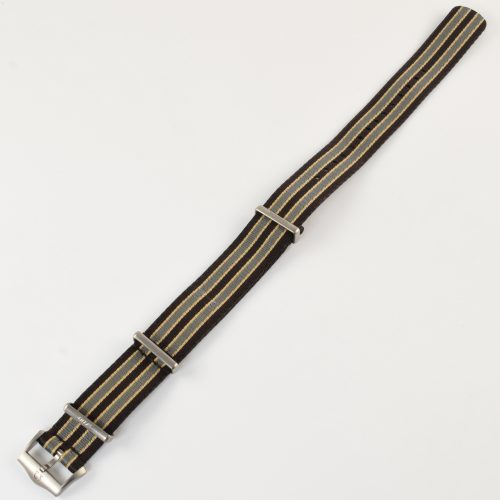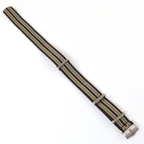 This Omega 007 Edition NATO Watch Strap is made to fit Omega watches with a 20mm lug width. It was originally supplied with the Seamaster Diver 300M 007 Edition, model 210.92.42.20.01.001. The strap features a vintage-inspired striped colourway in brown, grey, and beige polyamide and includes lightweight titanium hardware for durability and corrosion resistance.