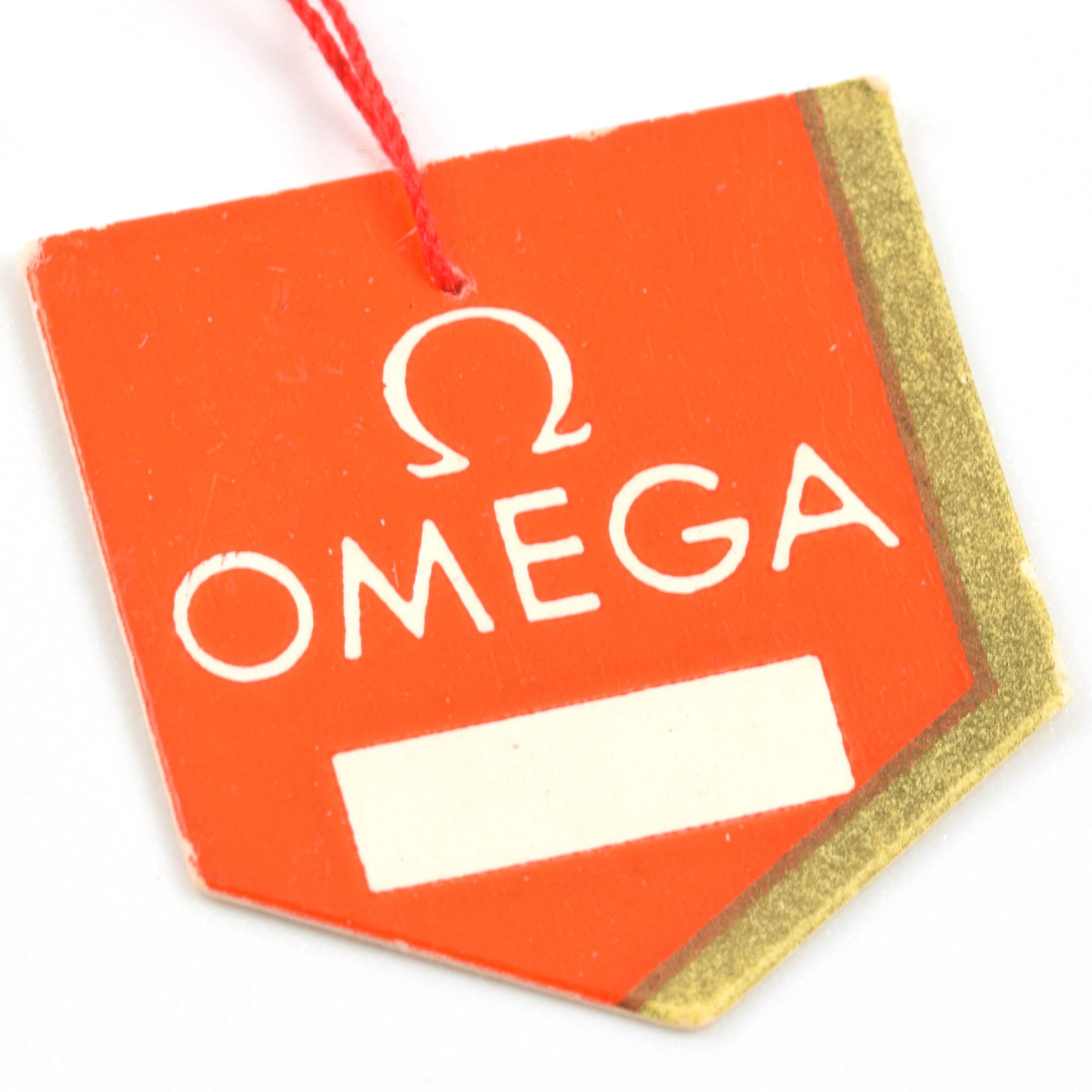 - Authentic red plastic Omega swing tag with raised logo and Omega clip on back
