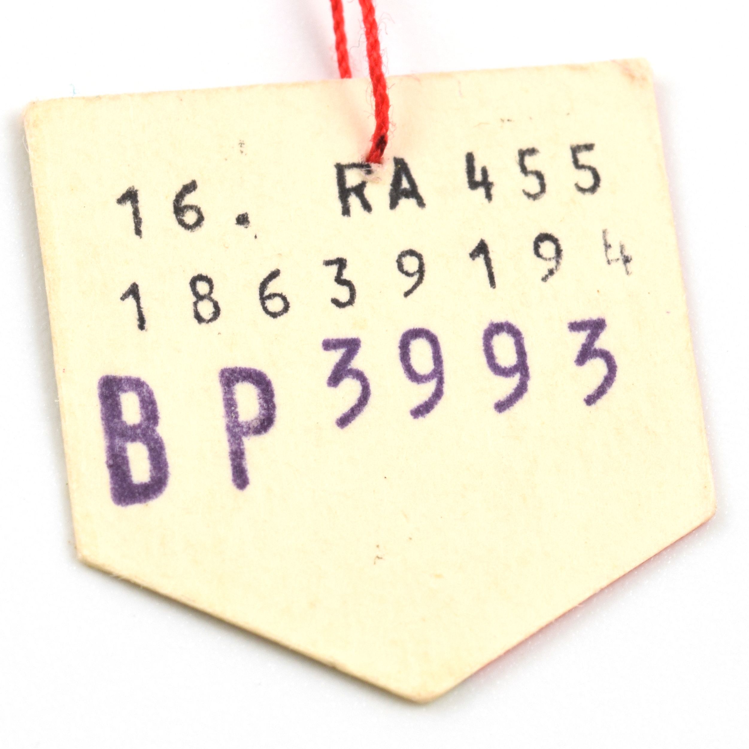 - Vintage arrow-cut Omega tag stamped RA 455, 18639194, BP3993