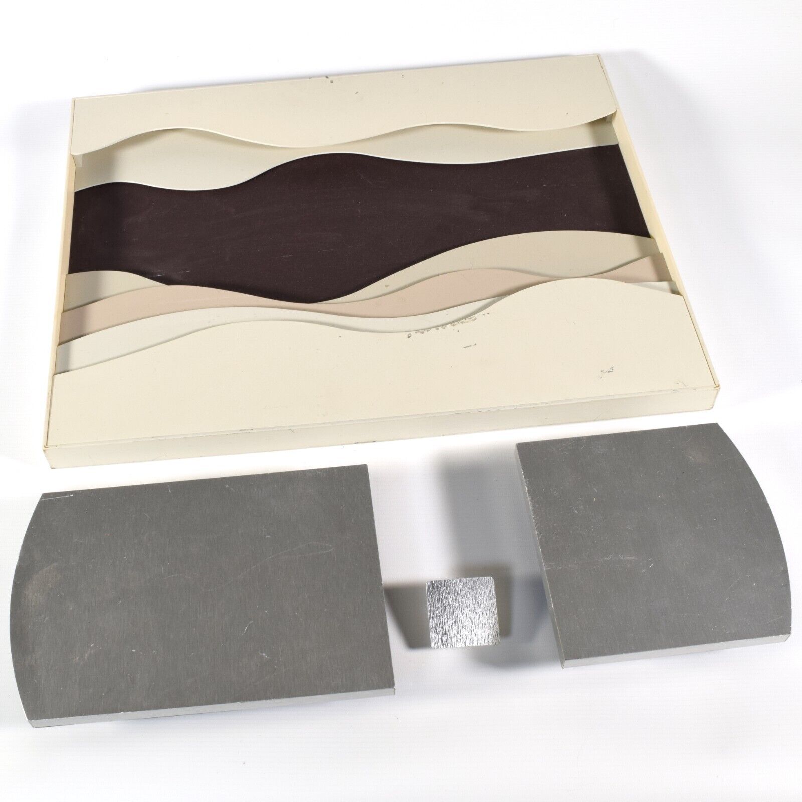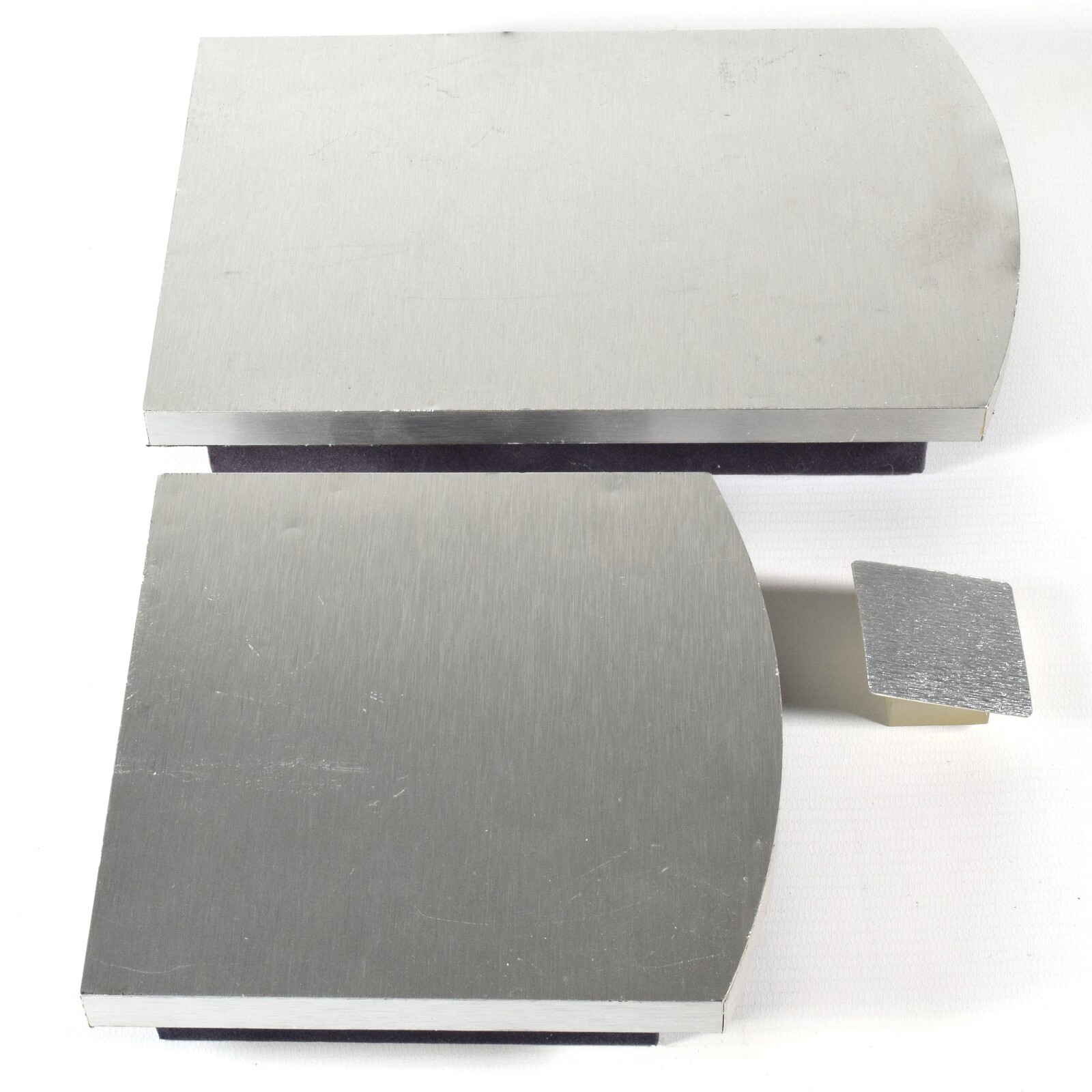This is a complete set of watch shop display items, including everything shown in the photos. You will receive the large wave-style tray, two brushed steel curved podiums, and one small square metal display stand.